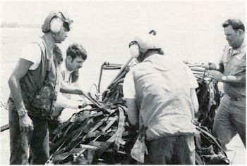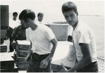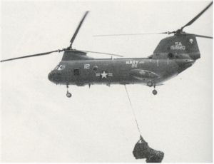 VERTREP Much of our supplies and food stores were conveniently delivered to us from the air by the method known as vertical replenishment. CH-46 helicopters from USS KISKA and USS NIAGRA FALLS provided us with VERTREP services. The "fun" part for us was moving the stores from the flight deck to the Supply spaces. |