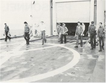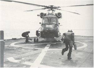 FLIGHT OPS "FLIGHT QUARTERS! FLIGHT QUARTERS! ALL HANDS MAN YOUR FLIGHT QUARTERS STATIONS. REMOVE ALL COVERS, LOOSE GEAR AND DEBRIS. ALL HANDS REMAIN FORWARD OF THE WEATHER DECKS, AFT OF THE BOAT DECKS. SMOKING LAMP IS OUT TOPSIDE WHILE THE SHIP IS CONDUCTING FLIGHT OPERATIONS." It seems as if we heard those words at least 100 times a day. Our LAMPS Det kept us very busy during deployment. On some days we spent as many as 3 hours at flight quarters off and on. No matter what the mission, we were always prepared for launch or recovery. |