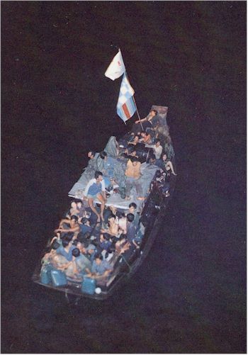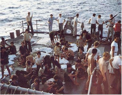 RESCUE AT SEA On the morning of 26 MAY 1982, as we transited through the South China Sea, SM1 Sam Lorton spotted a white distress flare in the darkness of the early morning. Thirty minutes later, as we approached the area, a small wooden boat appeared out of the darkness. Determining their situation to be helpless, we brought 82 Vietnamese refugees onboard BREWTON. We fed them, clothed them, loved them in our own way. We learned that they had escaped from Vietnam hoping to be picked up by a passing ship. That afternoon, we transferred the refugees to the USS FOX by small boat. For many of us, it was "the highlight of the deployment." As a result of our efforts, we were awarded the Navy Humanitarian Service Medal. "SEAL TEAM TWO personnel, many of whom knew and operated with LT. "Bubba" Brewton note with pleasure that USS BREWTON lives up to its motto of prepared, dedicated and determined service. Congratulations and Bravo Zulu on again being a key participant in a successful refugee rescue action."