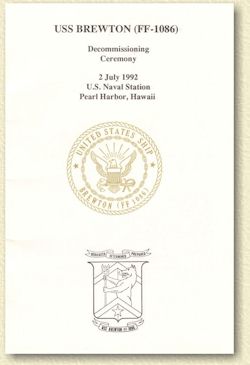 WELCOME! These pages re-create the USS Brewton's 1992 Decommissioning Book in web page format. This book was given to everyone attending the decommissioning ceremony on 2 July 1992. Special thanks go out to Walt Silva for donating this book so that it could be put up on the internet. Read below for instructions on how to find your way around the book. You can also view a text-only version of the book here. Please feel free to drop me a note if you have any questions or comments. -Mark Lookabaugh |