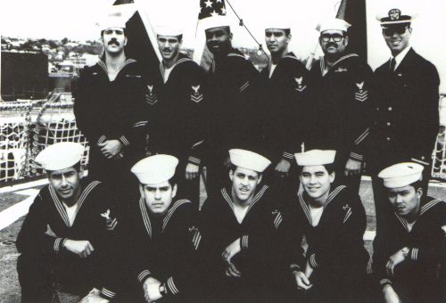 FIRST ROW: DC2 Harold Aragon III, DCFN Mark Valenzuela, DCFN Bert, DCFN Tony Norsworthy, HT2 Price. SECOND ROW: HT1 Mark Loconte, HT2 Brian Pully, FN Billy Gordon, DC3 Cliff Walker, HT1 Alan Goldstein, ENS Christian Heinrichs