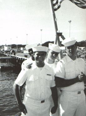 ![]() ABOVE: DK1 Tackett and FC1 Jones say goodbye to their loved ones one last time. RIGHT: SK3 Sterry, SK2 Williams, SHSN Hardy and SHSN Williams are ready to set the Special Sea and Anchor Detail. |