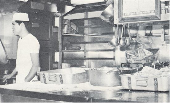 | The Supply Department had its own vital functions that kept the Brewton underway. The Disbursing Clerks were only seen by many twice a month, to be paid the money that disappeared so easily in the next port. The Ship's Servicemen laundried the clothes of working men, kept everyone's hair neat and trim and helped everyone's diet with snacks from the ship's store. The Storekeepers worked with their calculators, 1250's and manuals to keep parts on board to repair the vital machineries of war and peace. Then there are the Mess Specialists who prepared those memorable meals that kept everyone from losing weight. The Supply Department, the unsung hero that kept man and machinery on the go. |