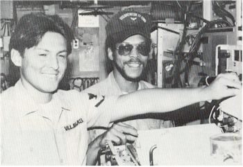TOP ROW: L. TO R. EW1 Corliss, ET3 Kee, EW2 Williams, ET3 Cobb, ET2 Carter, EW2 Ashton, ET3 Williford, LTJG Pallas. BOT ROW: L. TO R. ETC Fredrickson, ET2 Yuhas, ET1 Williams, ET2 Esquibel, ETSN Surratt, ET3 Villegas.