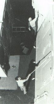 | WA Div. started off WESTPAC "86-87" at a fast pace. After two successful firings, one being ASROC and the other one a Torpedo, USS BREWTON and WA Div. sailed into the Northern Pacific to do what they do best; go "Tail Wet" and hunt submarines. The Northern Pacific operations were quite successful and WA conducted extensive training. Outside of the Philippines, WA used their Active Sonar in an exercise effectively locating, tracking and achieving a Fire Control solution on a submarine. From Singapore, BREWTON and WA charged into the Indian Ocean to show a present of force and was involved in several "Tail OPS" before anchoring off Masirah. At Masirah BREWTON was tasked to guard the rest of the Battle Group at anchor by patrolling the area. BREWTON and WA were again involved in several active and passive tracking exercises along its way to Geraldton, Australia. Upon completion of a terrific port visit in Australia, BREWTON resumed her duties in screening the Battle Group. We detach from the Battle Group and headed for Hawaii. WESTPAC "86-87" was finished with WA and BREWTON proving once again it has the finest ASW team in the Pacific. | ![]() GMM's painting after an ASROC launch |